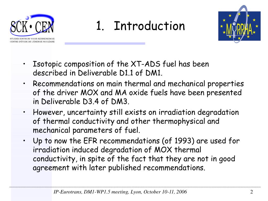 Introduction • Isotopic composition of the XT-ADS fuel has been described in Deliverable D1.1 of DM1. • Recommendations on main thermal and mechanical properties of the driver MOX and MA oxide fuels have been presented in Deliverable D3.4 of DM3. • However, uncertainty still exists on irradiation degradation of thermal conductivity and other thermophysical and mechanical parameters of fuel. • Up to now the EFR recommendations (of 1993) are used for irradiation induced degradation of MOX thermal conductivity, in spite of the fact that they are not in good agreement with later published recommendations.