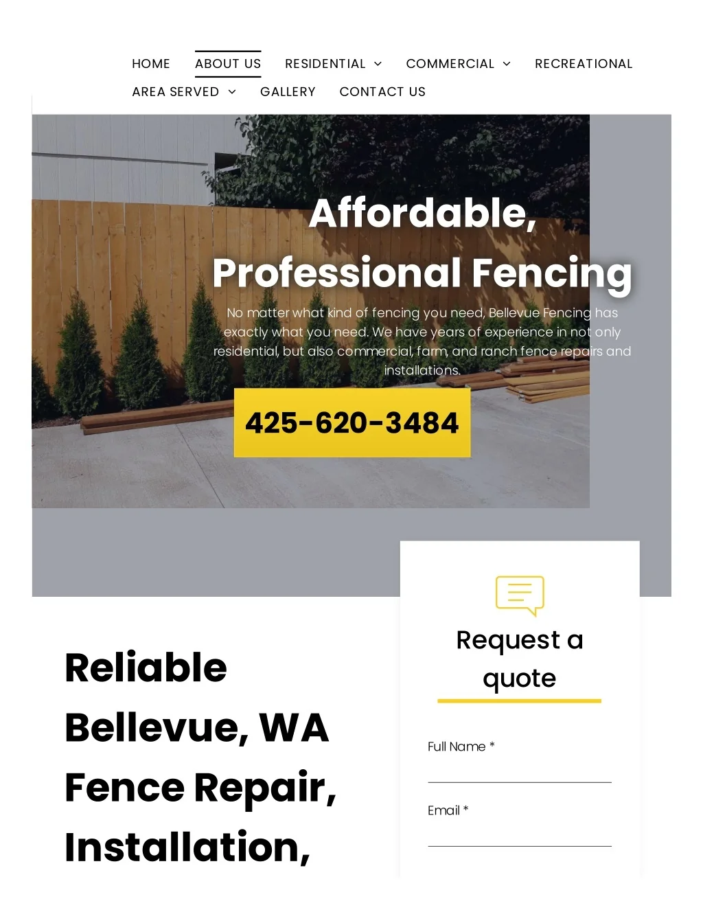 HOME ABOUT US RESIDENTIAL COMMERCIAL RECREATIONAL AREA SERVED GALLERY CONTACT US Affordable, Affordable, Professional Fencing Professional Fencing No matter what kind of fencing you need, Bellevue Fencing has exactly what you need. We have years of experience in not only residential, but also commercial, farm, and ranch fence repairs and installations. 425-620-3484 Request a quote Reliable Bellevue, WA Fence Repair, Installation, Full Name * Email *
