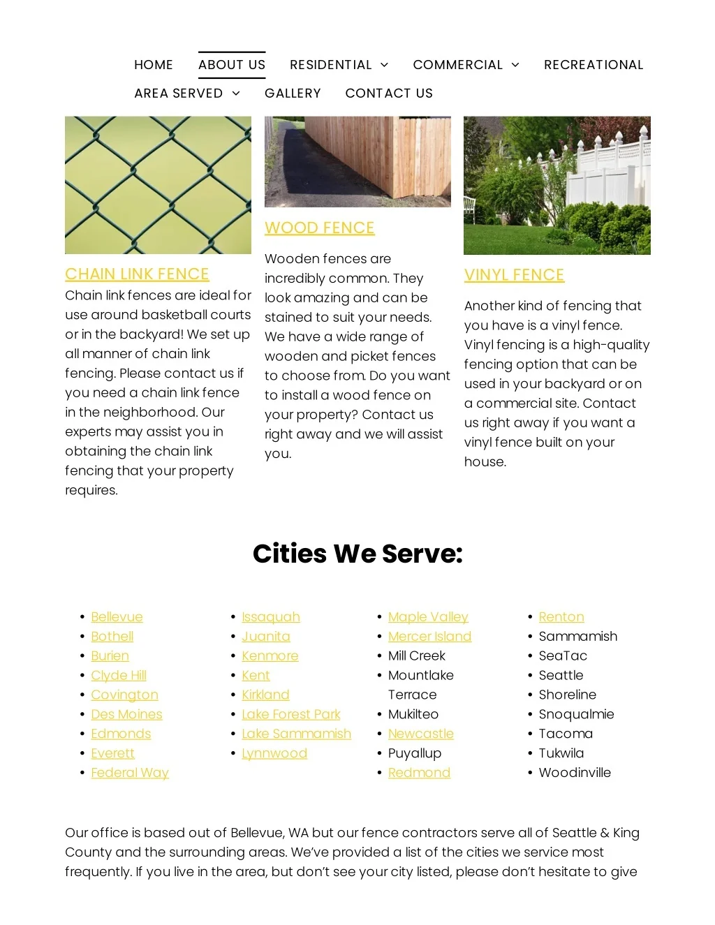 HOME ABOUT US RESIDENTIAL COMMERCIAL RECREATIONAL AREA SERVED GALLERY CONTACT US WOOD FENCE Wooden fences are incredibly common. They look amazing and can be stained to suit your needs. We have a wide range of wooden and picket fences to choose from. Do you want to install a wood fence on your property? Contact us right away and we will assist you. CHAIN LINK FENCE Chain link fences are ideal for use around basketball courts or in the backyard! We set up all manner of chain link fencing. Please contact us if you need a chain link fence in the neighborhood. Our experts may assist you in obtaining the chain link fencing that your property requires. VINYL FENCE Another kind of fencing that you have is a vinyl fence. Vinyl fencing is a high-quality fencing option that can be used in your backyard or on a commercial site. Contact us right away if you want a vinyl fence built on your house. Cities We Serve: • Bellevue • Bothell • Burien • Clyde Hill • Covington • Des Moines • Edmonds • Everett • Federal Way • Issaquah • Juanita • Kenmore • Kent • Kirkland • Lake Forest Park • Lake Sammamish • Lynnwood • Maple Valley • Mercer Island • Mill Creek • Mountlake Terrace • Mukilteo • Newcastle • Puyallup • Redmond • Renton • Sammamish • SeaTac • Seattle • Shoreline • Snoqualmie • Tacoma • Tukwila • Woodinville Our office is based out of Bellevue, WA but our fence contractors serve all of Seattle & King County and the surrounding areas. We’ve provided a list of the cities we service most frequently. If you live in the area, but don’t see your city listed, please don’t hesitate to give