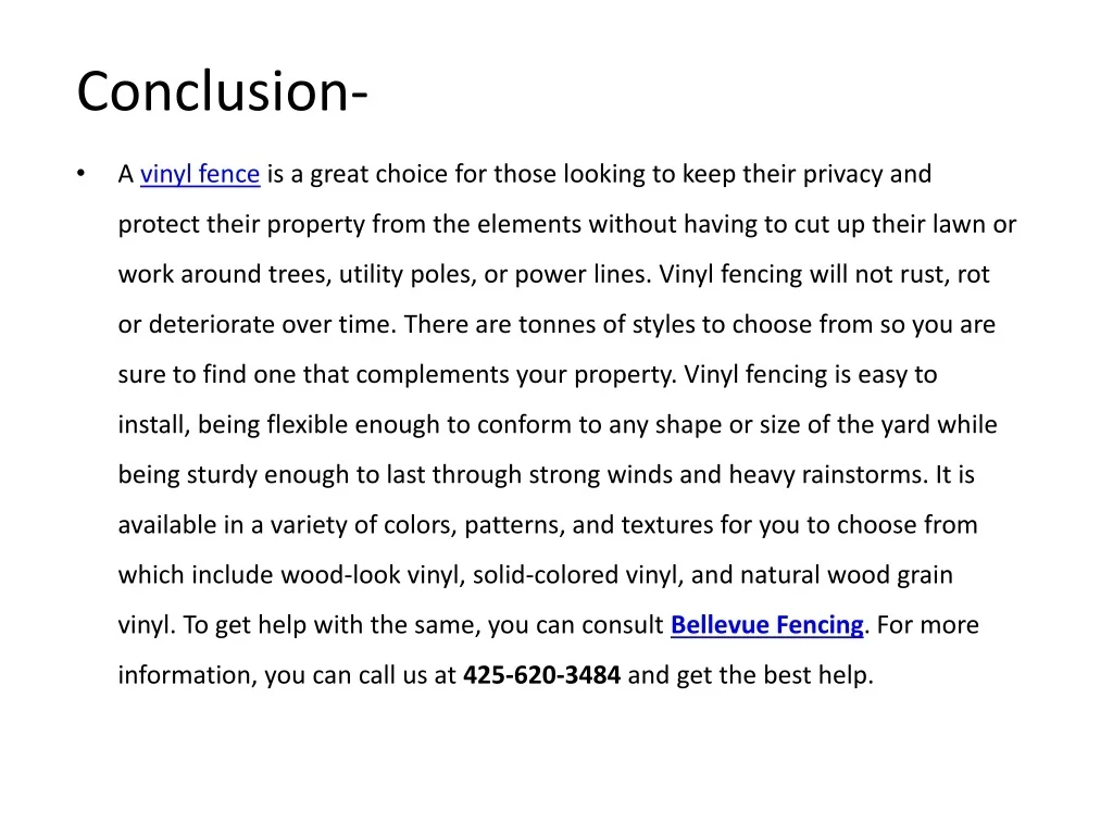 Conclusion- • A vinyl fence is a great choice for those looking to keep their privacy and protect their property from the elements without having to cut up their lawn or work around trees, utility poles, or power lines. Vinyl fencing will not rust, rot or deteriorate over time. There are tonnes of styles to choose from so you are sure to find one that complements your property. Vinyl fencing is easy to install, being flexible enough to conform to any shape or size of the yard while being sturdy enough to last through strong winds and heavy rainstorms. It is available in a variety of colors, patterns, and textures for you to choose from which include wood-look vinyl, solid-colored vinyl, and natural wood grain vinyl. To get help with the same, you can consult Bellevue Fencing. For more information, you can call us at 425-620-3484 and get the best help.