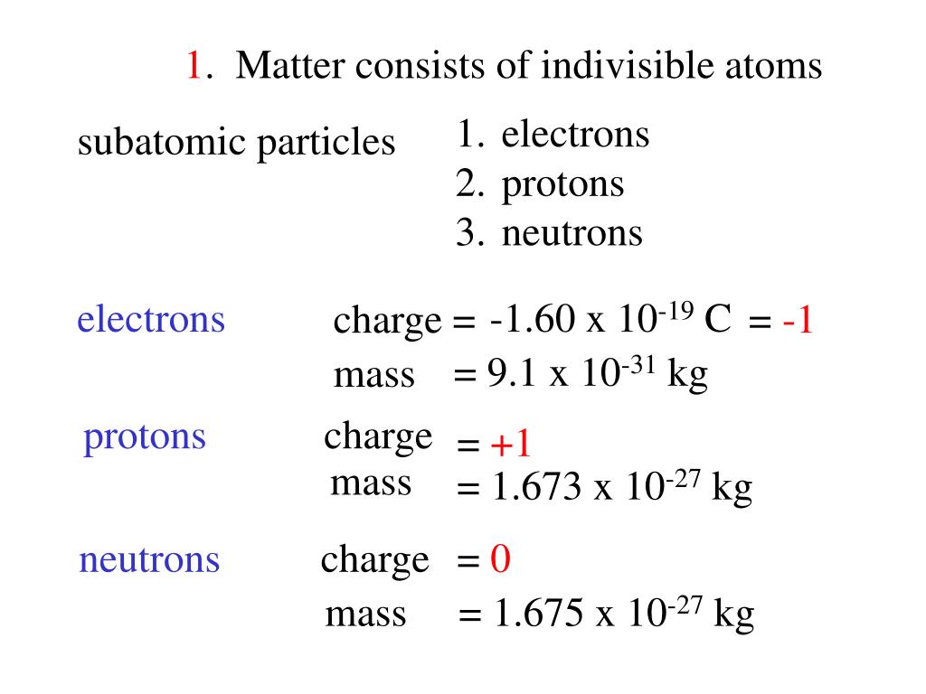 1. Matter consists of indivisible atoms • electrons • protons • neutrons subatomic particles electrons -1.60 x 10-19 C charge = = -1 = 9.1 x 10-31 kg mass protons charge = +1 mass = 1.673 x 10-27 kg neutrons charge = 0 mass = 1.675 x 10-27 kg