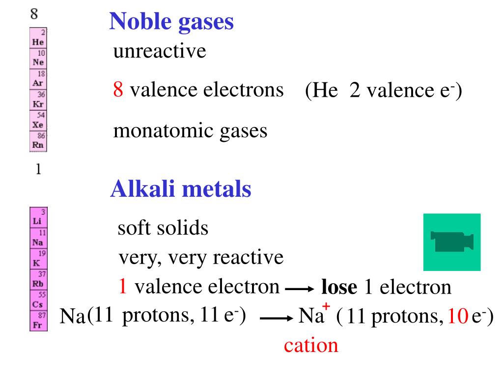 ( protons, e-) Na ( protons, e-) 11 Noble gases unreactive 8 valence electrons (He 2 valence e-) monatomic gases Alkali metals soft solids very, very reactive 1 valence electron lose 1 electron 11 11 Na 10 + cation