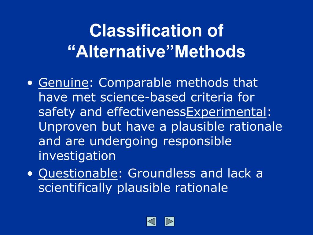 Classification of “Alternative”Methods • Genuine: Comparable methods that have met science-based criteria for safety and effectivenessExperimental: Unproven but have a plausible rationale and are undergoing responsible investigation • Questionable: Groundless and lack a scientifically plausible rationale