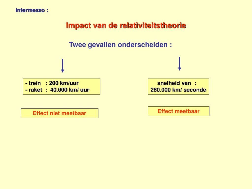 Intermezzo : Impact van de relativiteitstheorie Twee gevallen onderscheiden : - trein : 200 km/uur - raket : 40.000 km/ uur snelheid van : 260.000 km/ seconde Effect meetbaar Effect niet meetbaar γ = 1 γ = 1,006 (γ > 1) - c : de lichtsnelheid : 300.000 km/seconde - v : de snelheid van een voorwerp, een ref. stelsel