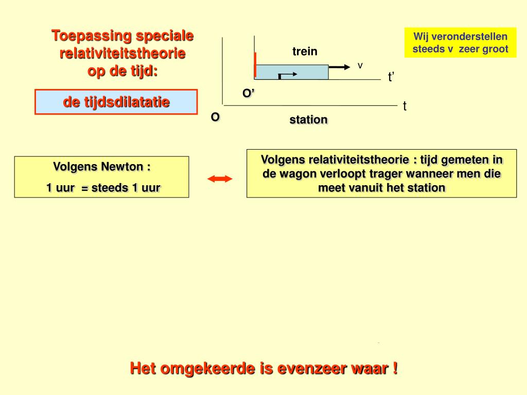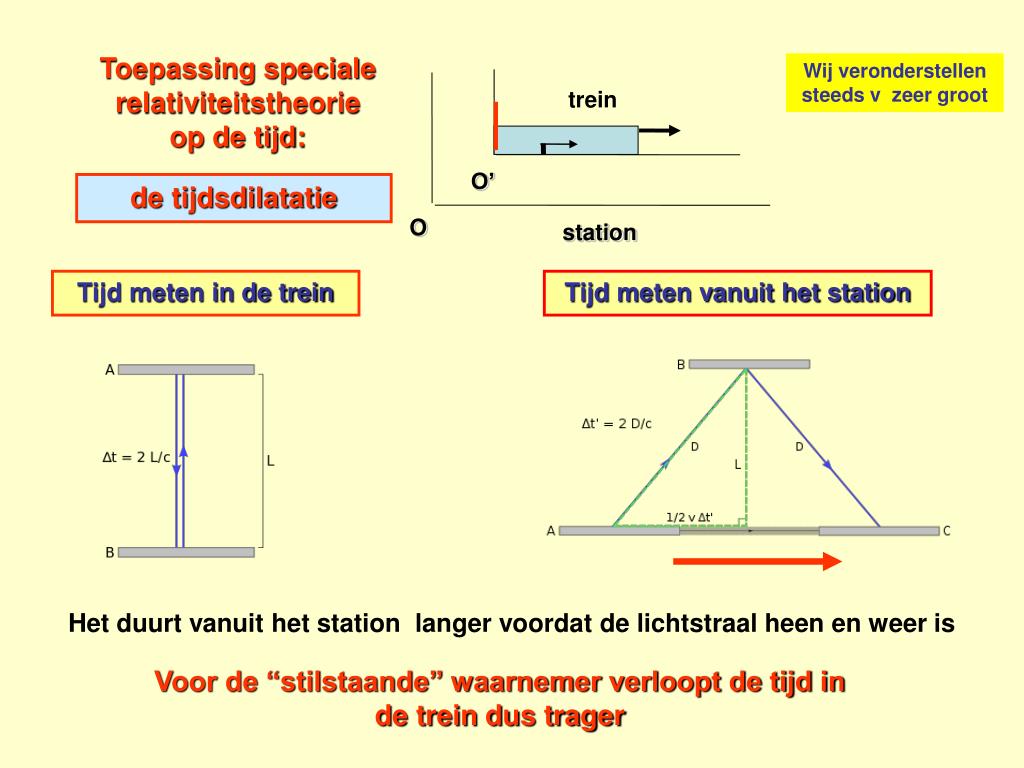 trein v t’ O’ t O station Toepassing speciale relativiteitstheorie op de tijd: Wij veronderstellen steeds v zeer groot de tijdsdilatatie Tijd meten in de trein Tijd meten vanuit het station Volgens Newton : 1 uur = steeds 1 uur Volgens relativiteitstheorie : tijd waargenomen vanuit het station loopt trager Het duurt vanuit het station langer voordat de lichtstraal heen en weer is Voor de “stilstaande” waarnemer verloopt de tijd in de trein dus trager