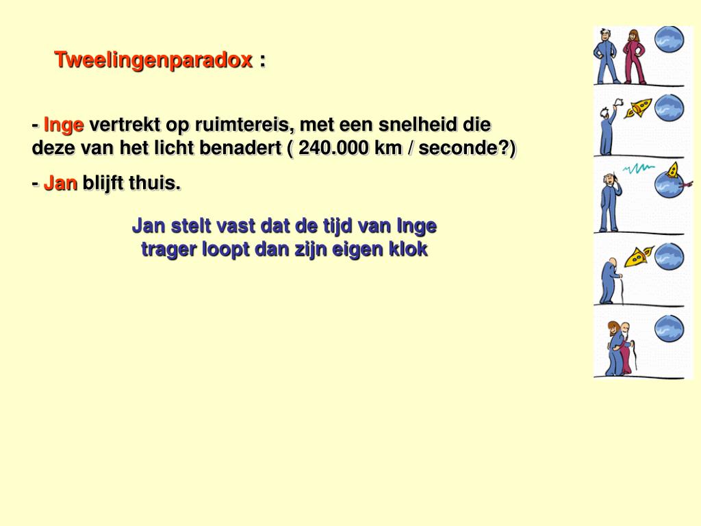 Tweelingenparadox : - Inge vertrekt op ruimtereis, met een snelheid die deze van het licht benadert ( 240.000 km / seconde?) - Jan blijft thuis. Jan stelt vast dat de tijd van Inge trager loopt dan zijn eigen klok Als Inge naar haar uurwerk kijkt na 1 uur …dan zal Jan het uurwerk van Inge trager zien lopen (1,36 uur ) Inge zal volgens haar Aardse broer Jan minder vlug oud geworden zijn Paradox : men kan evengoed de redenering omkeren Er is geen paradox als men beseft dat er geen universele tijd is. Elk voorwerp heeft zijn “eigen tijd”