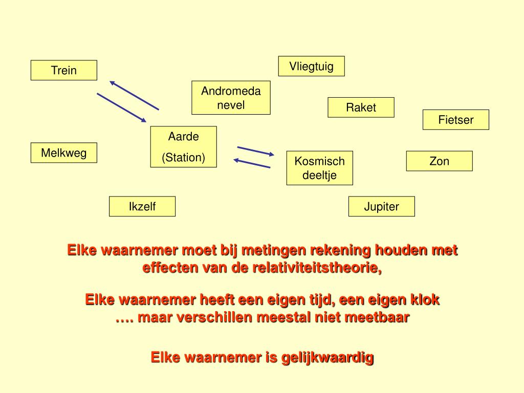 Vliegtuig Trein Andromeda nevel Raket Fietser Aarde (Station) Melkweg Kosmisch deeltje Zon Ikzelf Jupiter Elke waarnemer moet bij metingen rekening houden met effecten van de relativiteitstheorie, Elke waarnemer heeft een eigen tijd, een eigen klok …. maar verschillen meestal niet meetbaar Elke waarnemer is gelijkwaardig