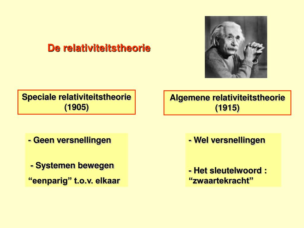De relativiteitstheorie Speciale relativiteitstheorie (1905) Algemene relativiteitstheorie (1915) - Geen versnellingen - Systemen bewegen “eenparig” t.o.v. elkaar - Wel versnellingen - Het sleutelwoord : “zwaartekracht”