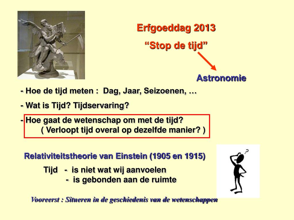 Erfgoeddag 2013 “Stop de tijd” Astronomie - Hoe de tijd meten : Dag, Jaar, Seizoenen, … - Wat is Tijd? Tijdservaring? - Hoe gaat de wetenschap om met de tijd? ( Verloopt tijd overal op dezelfde manier? ) Relativiteitstheorie van Einstein (1905 en 1915) Tijd - is niet wat wij aanvoelen - is gebonden aan de ruimte Vooreerst : Situeren in de geschiedenis van de wetenschappen