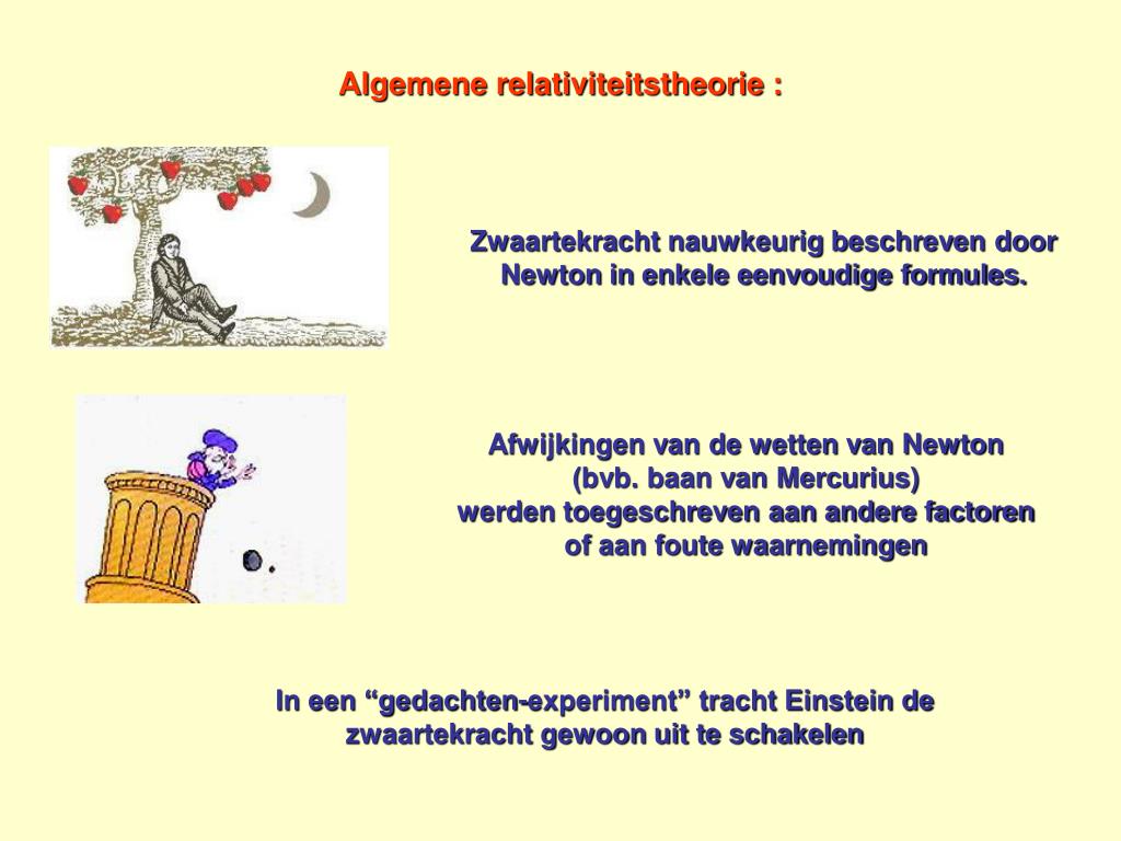 Algemene relativiteitstheorie : Newton had de zwaartekracht op een nauwkeurige manier beschreven in enkele zeer eenvoudige formules, die in de loop der jaren waren uitgegroeid tot een monument van de fysica. Afwijkingen van de fysica van Newton werden gewoon toegeschreven aan andere factoren of foute waarnemingen ( Baan Mercurius) Einstein breekt ook dit monument af. In een “gedachten-experiment” trachtte Einstein de zwaartekracht gewoon uit te schakelen