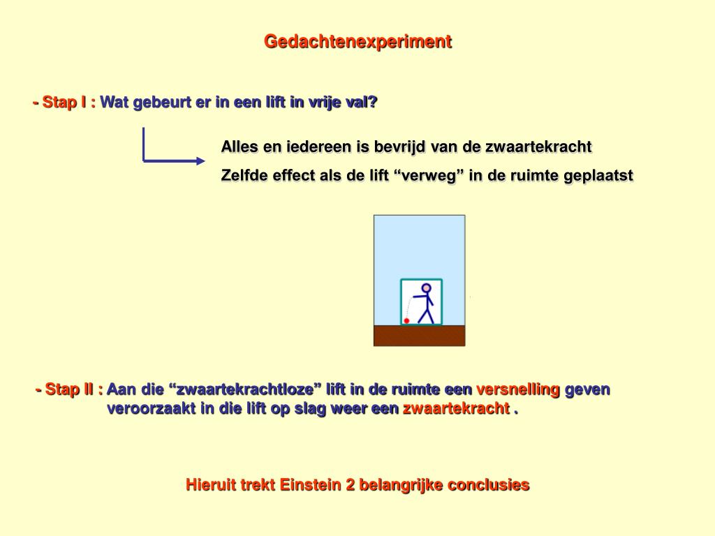Gedachtenexperiment - Stap I : Wat gebeurt er in een lift in vrije val? Alles en iedereen is bevrijd van de zwaartekracht Zelfde effect als de lift “verweg” in de ruimte geplaatst - Stap II :Aan die “zwaartekrachtloze” lift in de ruimte een versnelling geven veroorzaakt in die lift op slag weer een zwaartekracht . Hieruit trekt Einstein 2 belangrijke conclusies