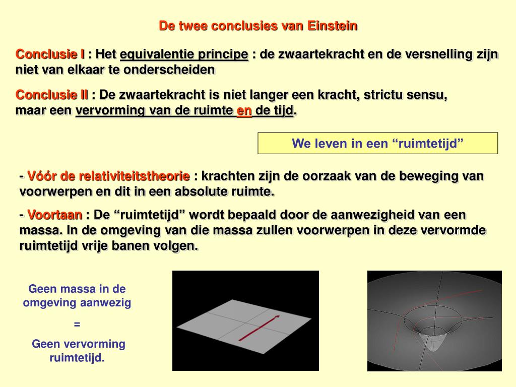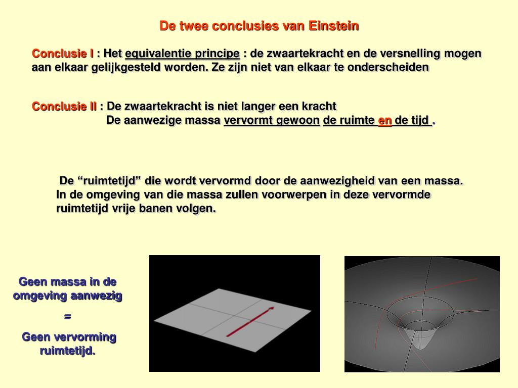 De twee conclusies van Einstein Conclusie I : Het equivalentie principe : de zwaartekracht en de versnelling mogen aan elkaar gelijkgesteld worden. Ze zijn niet van elkaar te onderscheiden Conclusie II : De zwaartekracht is niet langer een kracht De aanwezige massa vervormt gewoonde ruimte en de tijd . De “ruimtetijd” die wordt vervormd door de aanwezigheid van een massa. In de omgeving van die massa zullen voorwerpen in deze vervormde ruimtetijd vrije banen volgen. Geen massa in de omgeving aanwezig = Geen vervorming ruimtetijd.