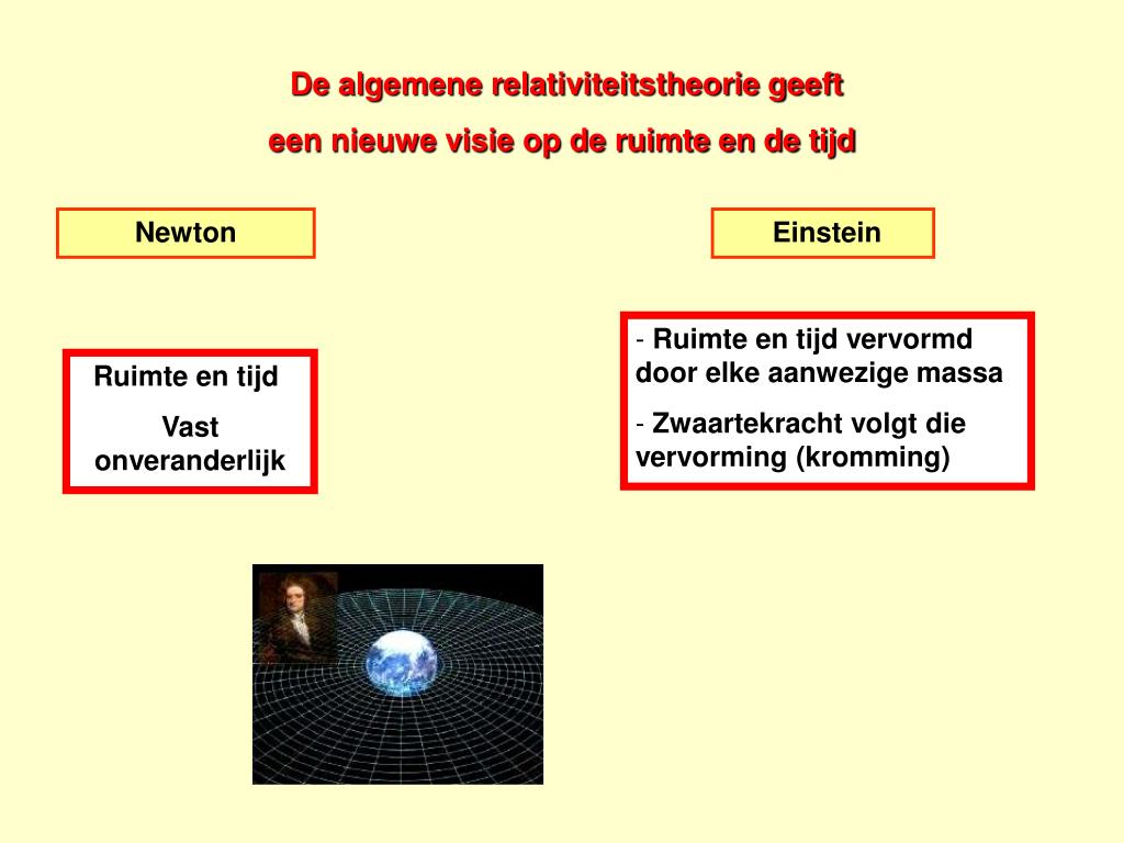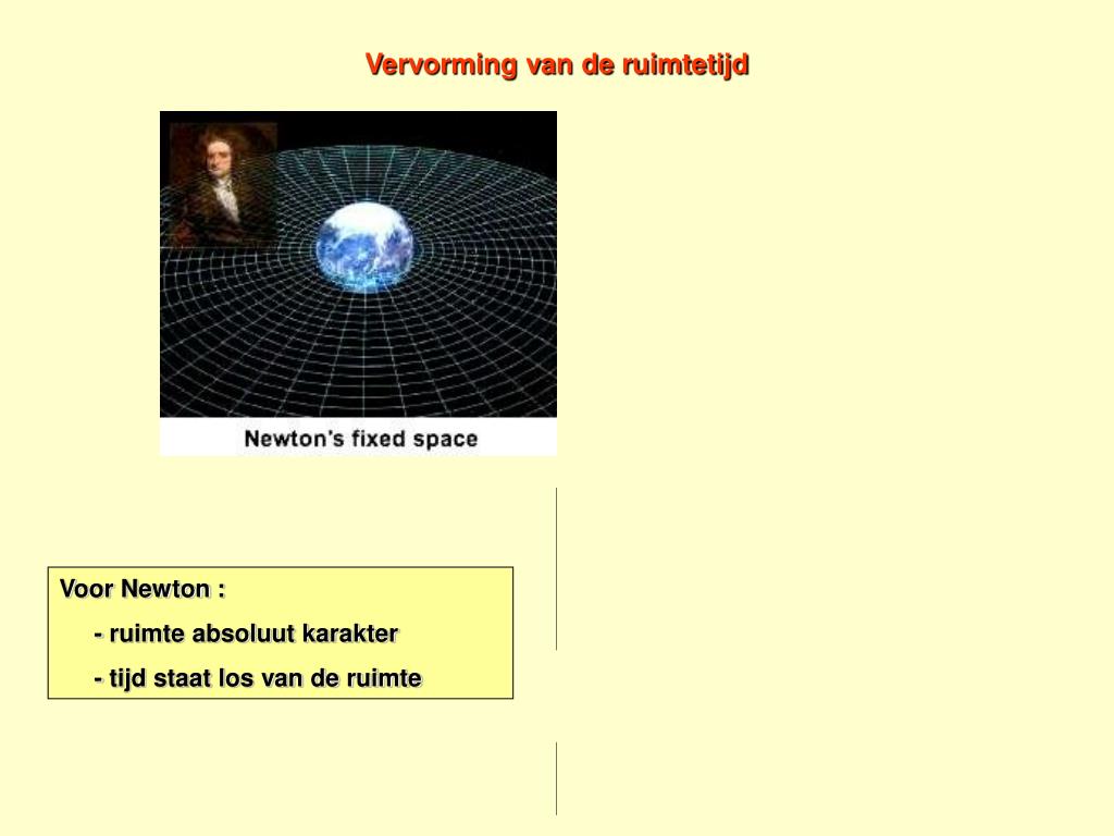 Vervorming van de ruimtetijd Voor Einstein : - is er een “ruimtetijd” - en deze ruimtetijd wordt vervormd door de aanwezigheid van een massa Voor Newton : - ruimte absoluut karakter - tijd staat los van de ruimte Geen massa in de omgeving betekent dus geen vervorming van de ruimtetijd.