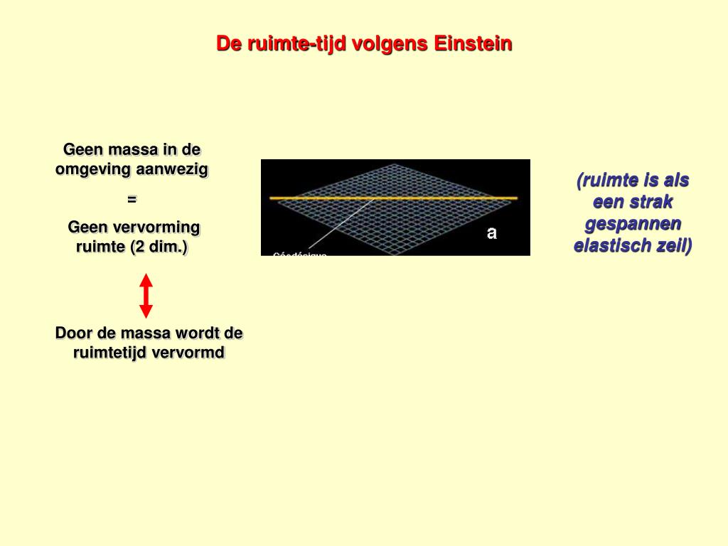 De ruimte-tijd volgens Einstein Geen massa in de omgeving aanwezig = Geen vervorming ruimte (2 dim.) (ruimte is als een strak gespannen elastisch zeil) Door de massa wordt de ruimtetijd vervormd