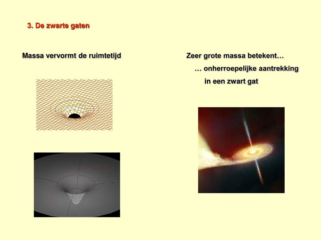 3. De zwarte gaten Massa vervormt de ruimtetijd Zeer grote massa betekent… … onherroepelijke aantrekking in een zwart gat
