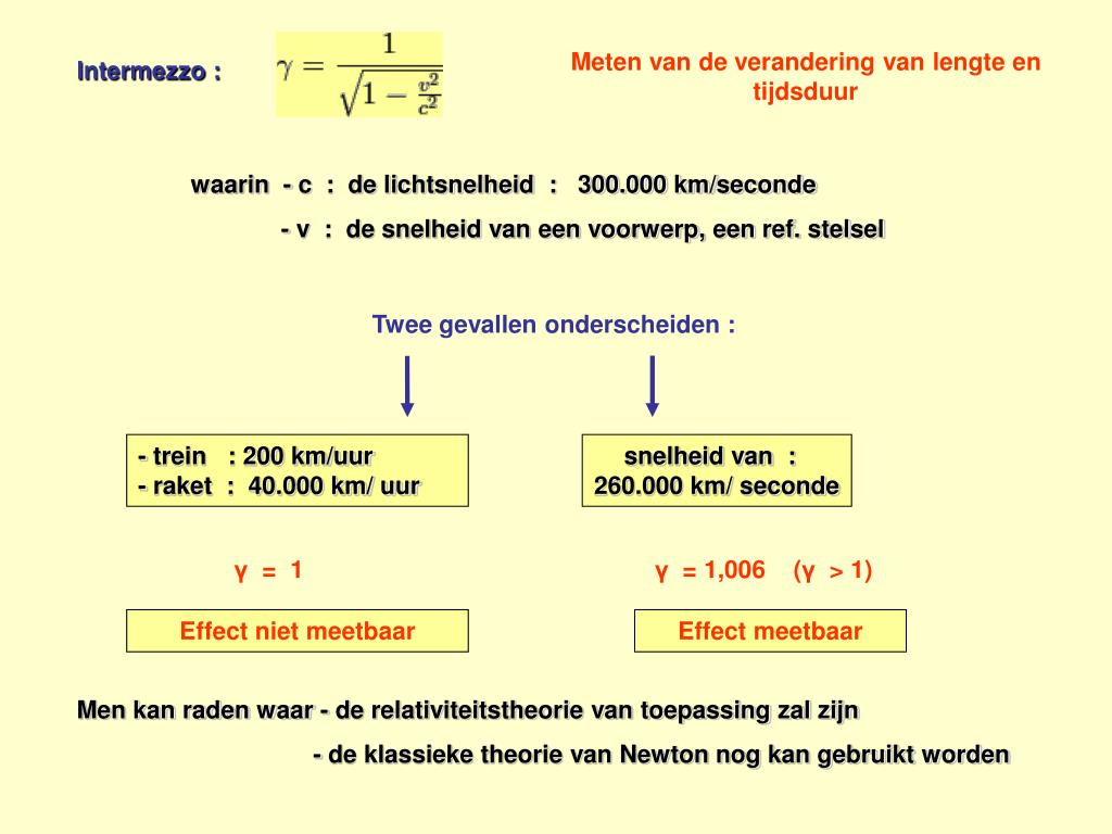 Meten van de verandering van lengte en tijdsduur Intermezzo : waarin - c : de lichtsnelheid : 300.000 km/seconde - v : de snelheid van een voorwerp, een ref. stelsel Twee gevallen onderscheiden : - trein : 200 km/uur - raket : 40.000 km/ uur snelheid van : 260.000 km/ seconde γ = 1 γ = 1,006 (γ > 1) Effect niet meetbaar Effect meetbaar Men kan raden waar - de relativiteitstheorie van toepassing zal zijn - de klassieke theorie van Newton nog kan gebruikt worden