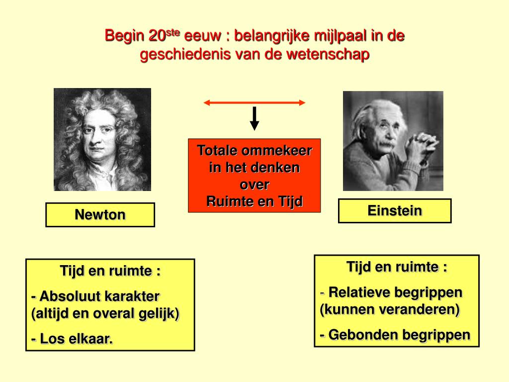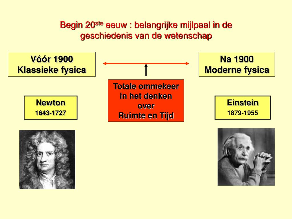 Begin 20ste eeuw : belangrijke mijlpaal in de geschiedenis van de wetenschap Vóór 1900 Klassieke fysica Na 1900 Moderne fysica Totale ommekeer in het denken over Ruimte en Tijd Newton 1643-1727 Einstein 1879-1955