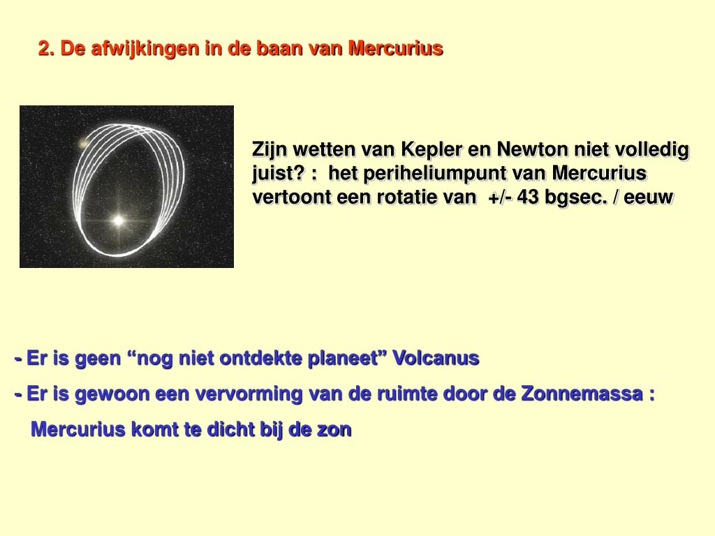 2. De afwijkingen in de baan van Mercurius Zijn wetten van Kepler en Newton niet volledig juist? : het periheliumpunt van Mercurius vertoont een rotatie van +/- 43 bgsec. / eeuw - Er is geen “nog niet ontdekte planeet” Volcanus - Er is gewoon een vervorming van de ruimte door de Zonnemassa : Mercurius komt te dicht bij de zon