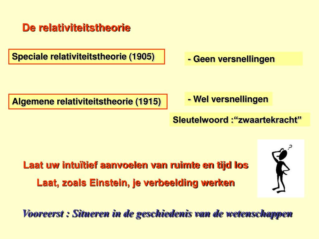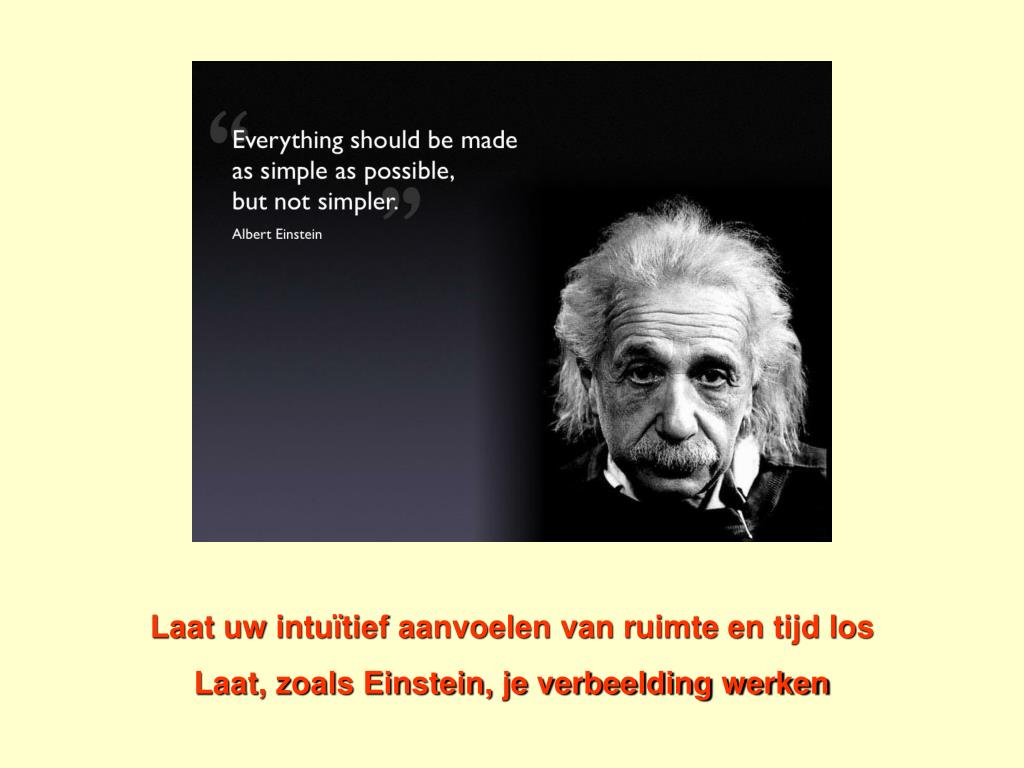 De relativiteitstheorie Speciale relativiteitstheorie (1905) - Geen versnellingen - Wel versnellingen Algemene relativiteitstheorie (1915) Sleutelwoord :“zwaartekracht” Laat uw intuïtief aanvoelen van ruimte en tijd los Laat, zoals Einstein, je verbeelding werken Vooreerst : Situeren in de geschiedenis van de wetenschappen