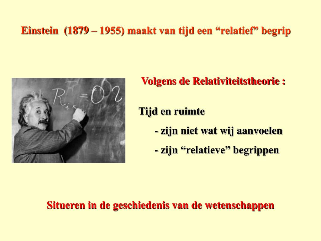 Einstein (1879 – 1955) maakt van tijd een “relatief” begrip Volgens de Relativiteitstheorie : Tijd en ruimte - zijn niet wat wij aanvoelen - zijn “relatieve” begrippen Situeren in de geschiedenis van de wetenschappen