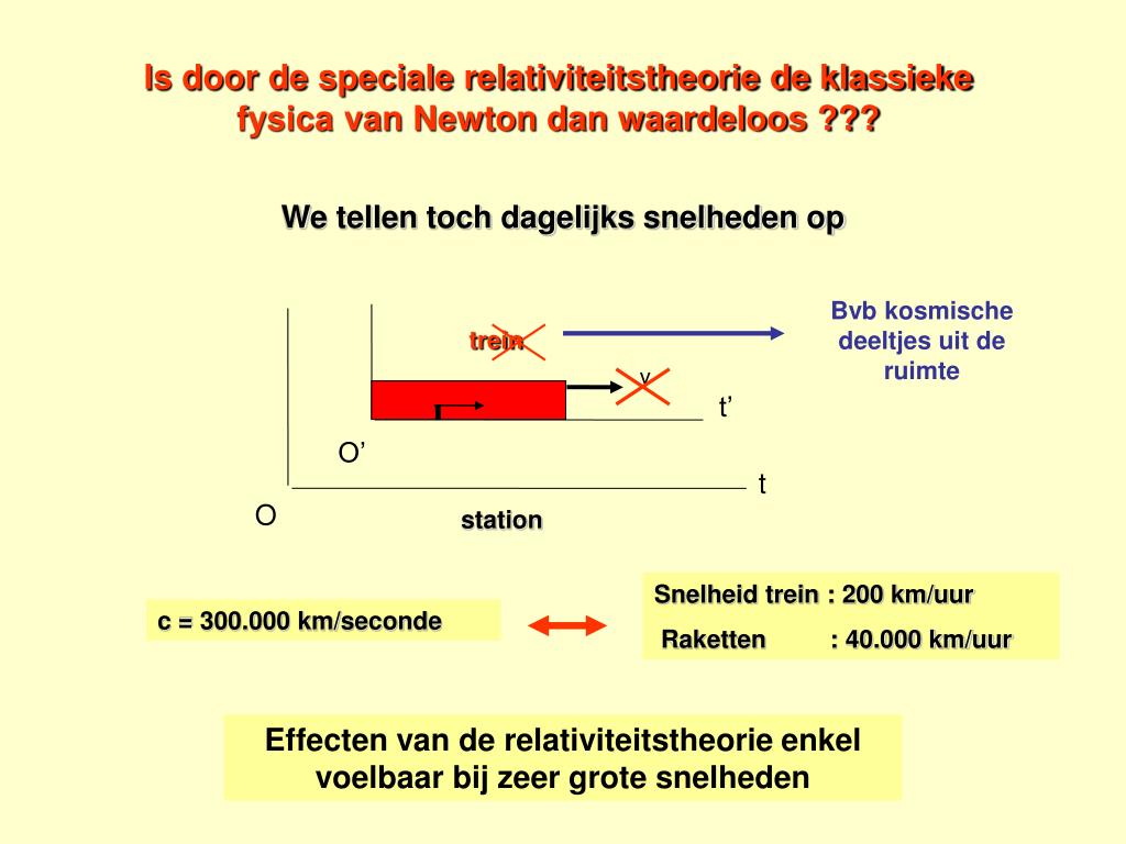 trein v t’ O’ t O station Is door de speciale relativiteitstheorie de klassieke fysica van Newton dan waardeloos ??? We tellen toch dagelijks snelheden op Bvb kosmische deeltjes uit de ruimte Snelheid trein : 200 km/uur Raketten : 40.000 km/uur c = 300.000 km/seconde Effecten van de relativiteitstheorie enkel voelbaar bij zeer grote snelheden