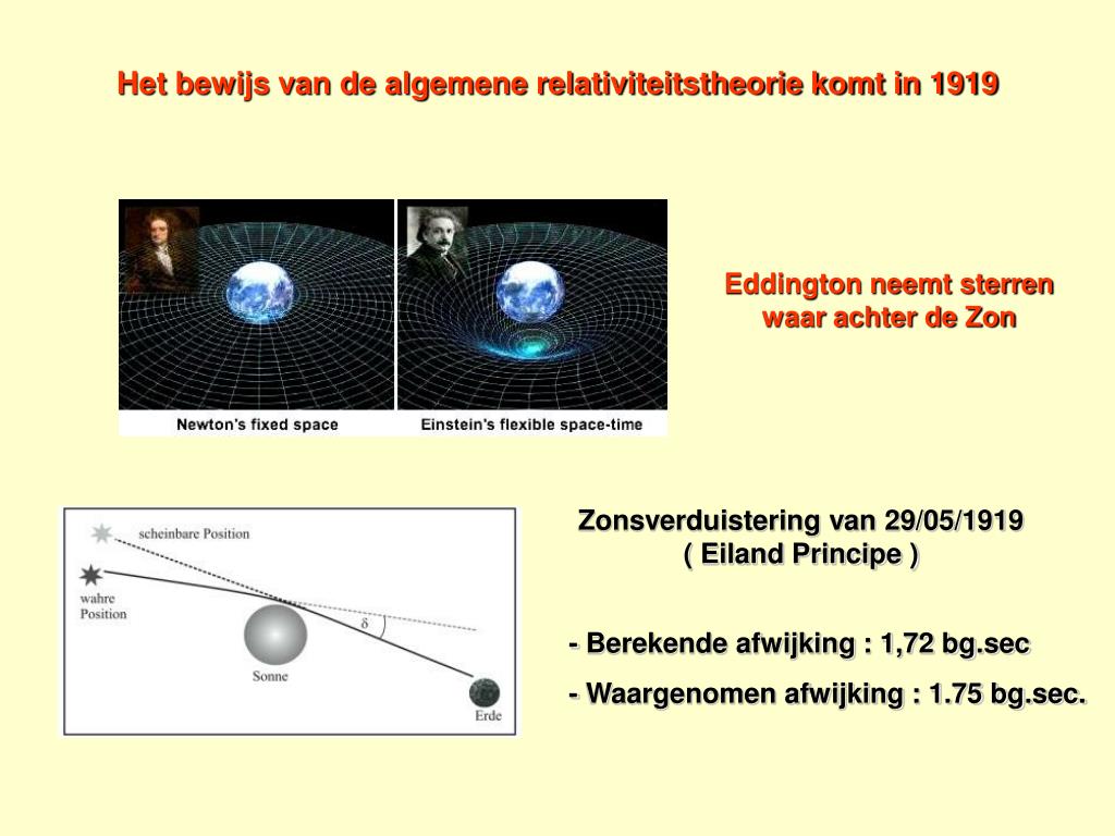 Het bewijs van de juistheid van de algemene relativiteitstheorie komt in 1919 Eddington neemt gedurende een eclips sterren waar achter de Zon Afwijking veroorzaakt door de Zon : +/- 1,75 bg.sec Einstein wordt op slag beroemd