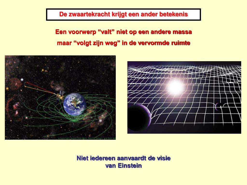 De zwaartekracht krijgt een ander betekenis Een voorwerp “valt” niet op een andere massa maar “volgt zijn weg” in de vervormde ruimte Niet iedereen aanvaardt de visie van Einstein