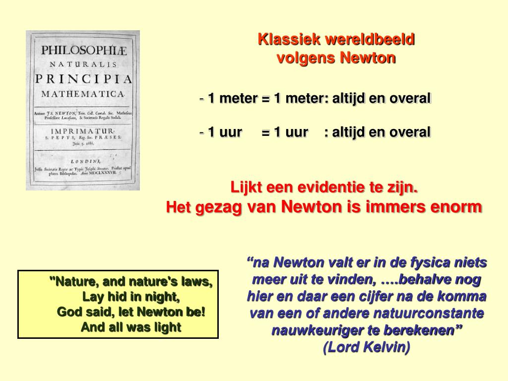 Klassiek wereldbeeld volgens Newton • 1 meter = 1 meter: altijd en overal • 1 uur = 1 uur : altijd en overal Lijkt een evidentie te zijn. Het gezag van Newton is immers enorm “na Newton valt er in de fysica niets meer uit te vinden, ….behalve nog hier en daar een cijfer na de komma van een of andere natuurconstante nauwkeuriger te berekenen” (Lord Kelvin) • "Nature, and nature's laws, • Lay hid in night, • God said, let Newton be! • And all was light