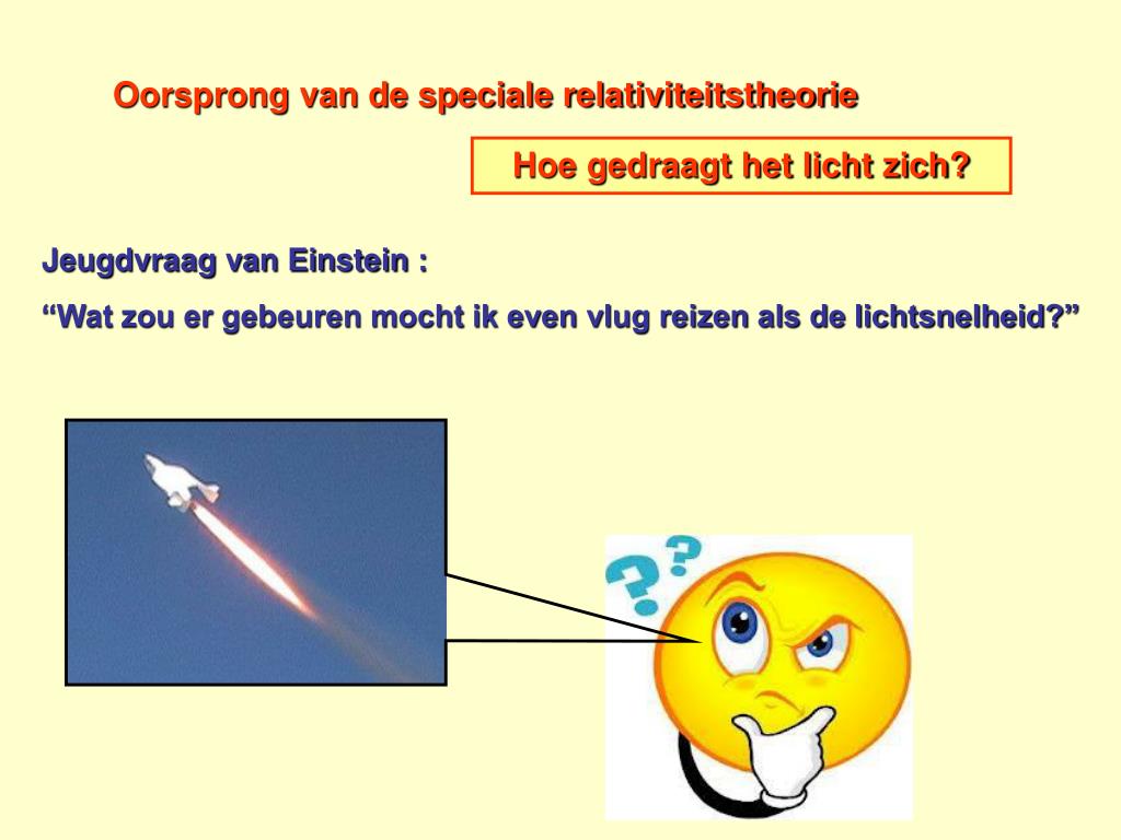 Oorsprong van de speciale relativiteitstheorie Hoe gedraagt het licht zich? Jeugdvraag van Einstein : “Wat zou er gebeuren mocht ik even vlug reizen als de lichtsnelheid?”