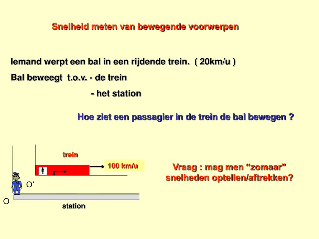 trein v t’ O’ t O station Snelheid meten van bewegende voorwerpen Iemand werpt een bal in een rijdende trein. ( 20km/u ) Bal beweegt t.o.v. - de trein - het station Hoe ziet een passagier in de trein de bal bewegen ? Hoe ziet de stationschef de bal bewegen ? 100 km/u Vraag : mag men “zomaar” snelheden optellen/aftrekken?