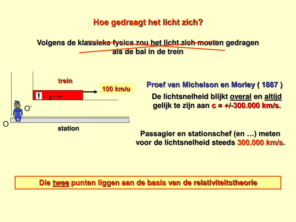 trein v t’ O’ t O station Hoe gedraagt het licht zich? Volgens de klassieke fysica zou het licht zich moeten gedragen als de bal in de trein Proef van Michelson en Morley ( 1887 ) 100 km/u De lichtsnelheid blijkt overal en altijd gelijk te zijn aan c = +/-300.000 km/s. Passagier en stationschef (en …) meten voor de lichtsnelheid steeds 300.000 km/s. Die twee punten liggen aan de basis van de relativiteitstheorie