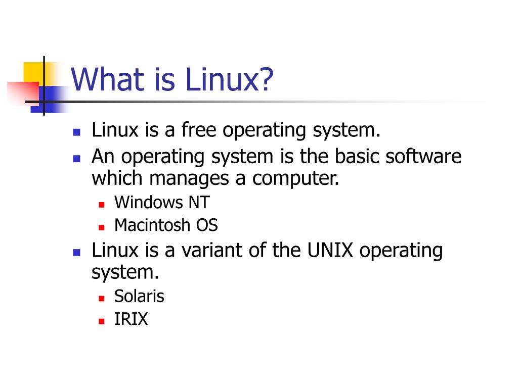 What is Linux? • Linux is a free operating system. • An operating system is the basic software which manages a computer. • Windows NT • Macintosh OS • Linux is a variant of the UNIX operating system. • Solaris • IRIX