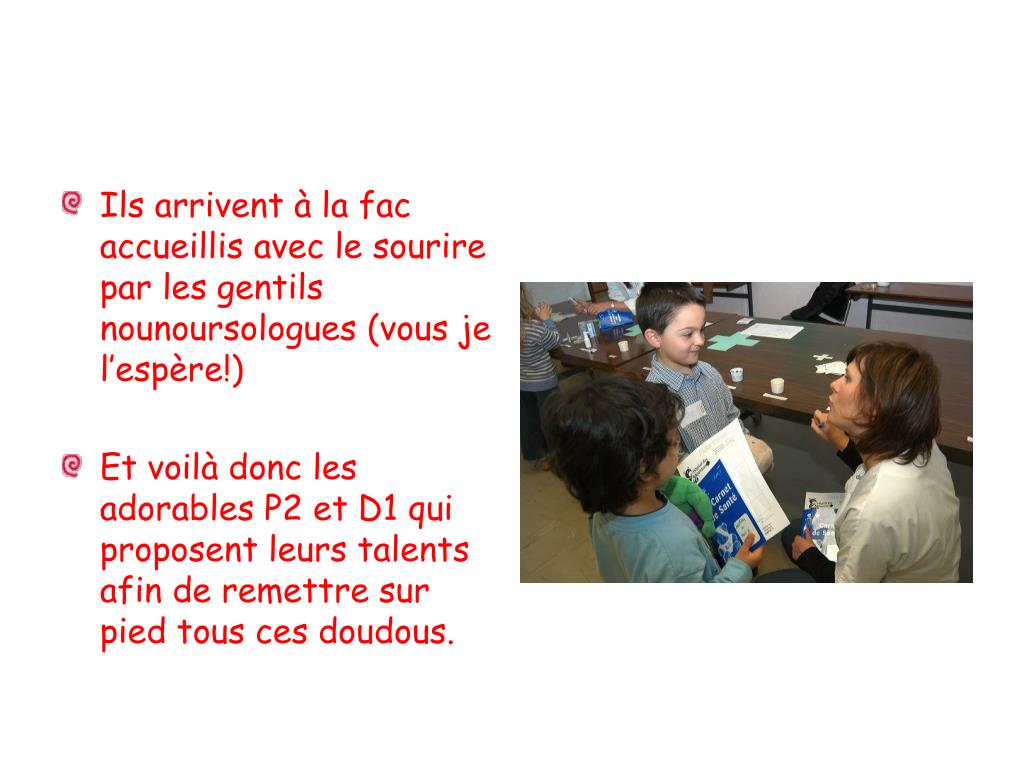 Ils arrivent à la fac accueillis avec le sourire par les gentils nounoursologues (vous je l’espère!) • Et voilà donc les adorables P2 et D1 qui proposent leurs talents afin de remettre sur pied tous ces doudous.