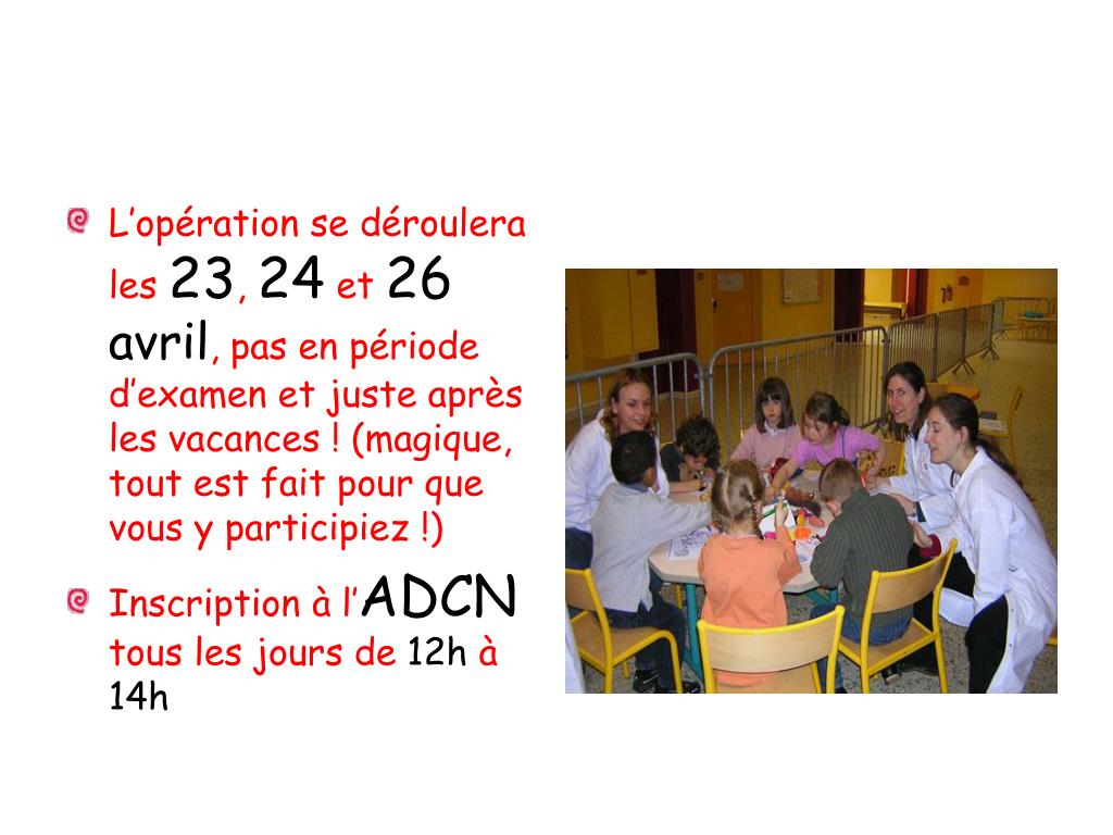 L’opération se déroulera les 23, 24 et 26 avril, pas en période d’examen et juste après les vacances ! (magique, tout est fait pour que vous y participiez !) • Inscription à l’ADCNtous les jours de 12h à 14h