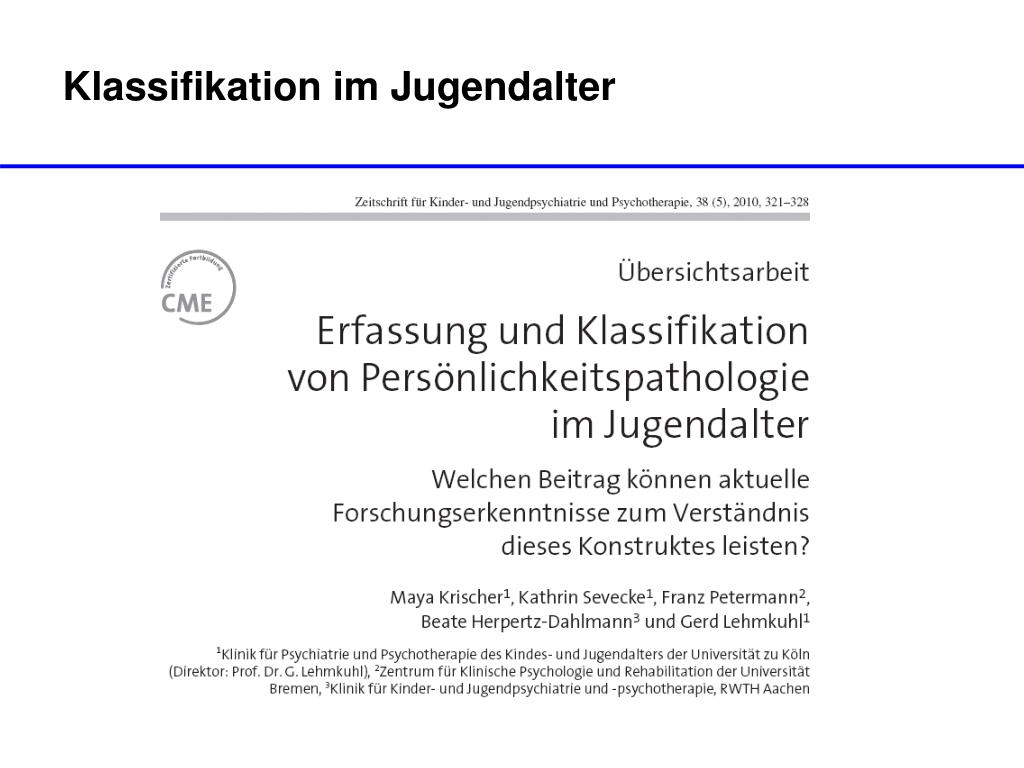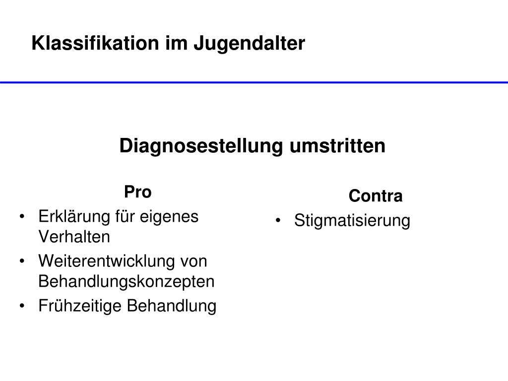 Klassifikation im Jugendalter Diagnosestellung umstritten Pro • Erklärung für eigenes Verhalten • Weiterentwicklung von Behandlungskonzepten • Frühzeitige Behandlung Contra • Stigmatisierung