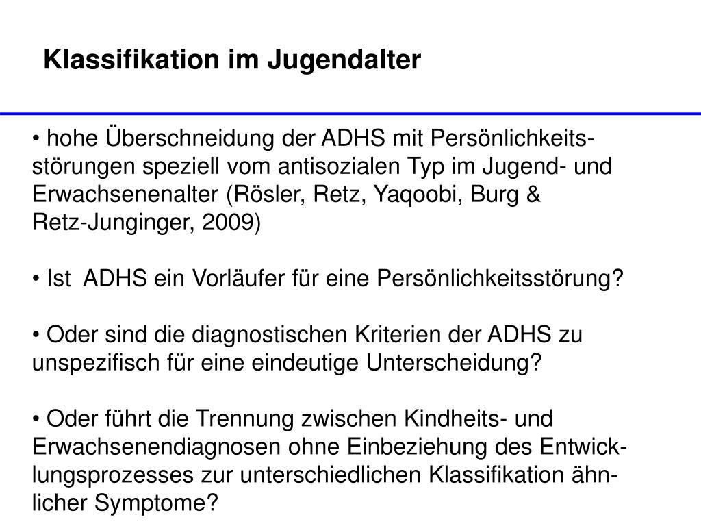 Klassifikation im Jugendalter • hohe Überschneidung der ADHS mit Persönlichkeits-störungen speziell vom antisozialen Typ im Jugend- und Erwachsenenalter (Rösler, Retz, Yaqoobi, Burg & • Retz-Junginger, 2009) • Ist ADHS ein Vorläufer für eine Persönlichkeitsstörung? • Oder sind die diagnostischen Kriterien der ADHS zu unspezifisch für eine eindeutige Unterscheidung? • Oder führt die Trennung zwischen Kindheits- und Erwachsenendiagnosen ohne Einbeziehung des Entwick-lungsprozesses zur unterschiedlichen Klassifikation ähn-licher Symptome?