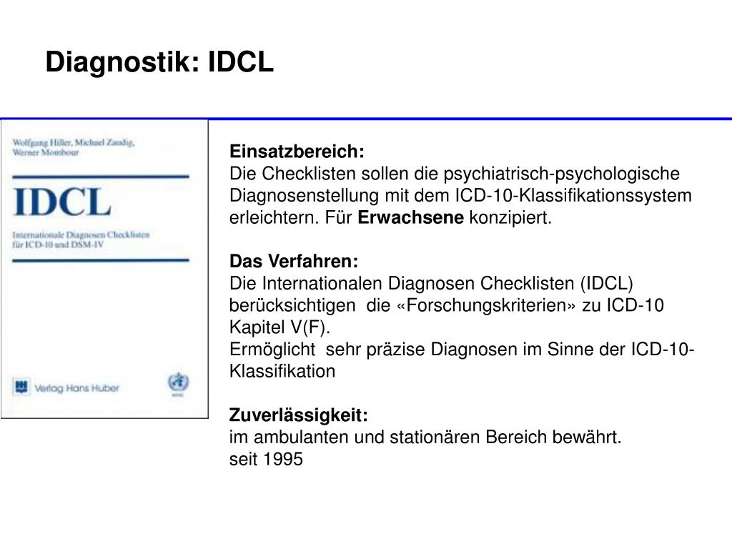 Diagnostik: IDCL Einsatzbereich: Die Checklisten sollen die psychiatrisch-psychologische Diagnosenstellung mit dem ICD-10-Klassifikationssystem erleichtern. Für Erwachsene konzipiert. Das Verfahren: Die Internationalen Diagnosen Checklisten (IDCL) berücksichtigen die «Forschungskriterien» zu ICD-10 Kapitel V(F). Ermöglicht sehr präzise Diagnosen im Sinne der ICD-10-Klassifikation Zuverlässigkeit: im ambulanten und stationären Bereich bewährt. seit 1995