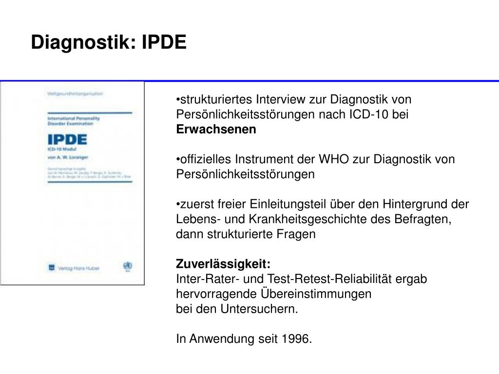Diagnostik: IPDE • strukturiertes Interview zur Diagnostik von • Persönlichkeitsstörungen nach ICD-10 bei Erwachsenen • offizielles Instrument der WHO zur Diagnostik von Persönlichkeitsstörungen • zuerst freier Einleitungsteil über den Hintergrund der Lebens- und Krankheitsgeschichte des Befragten, dann strukturierte Fragen • Zuverlässigkeit: • Inter-Rater- und Test-Retest-Reliabilität ergab hervorragende Übereinstimmungen • bei den Untersuchern. • In Anwendung seit 1996.
