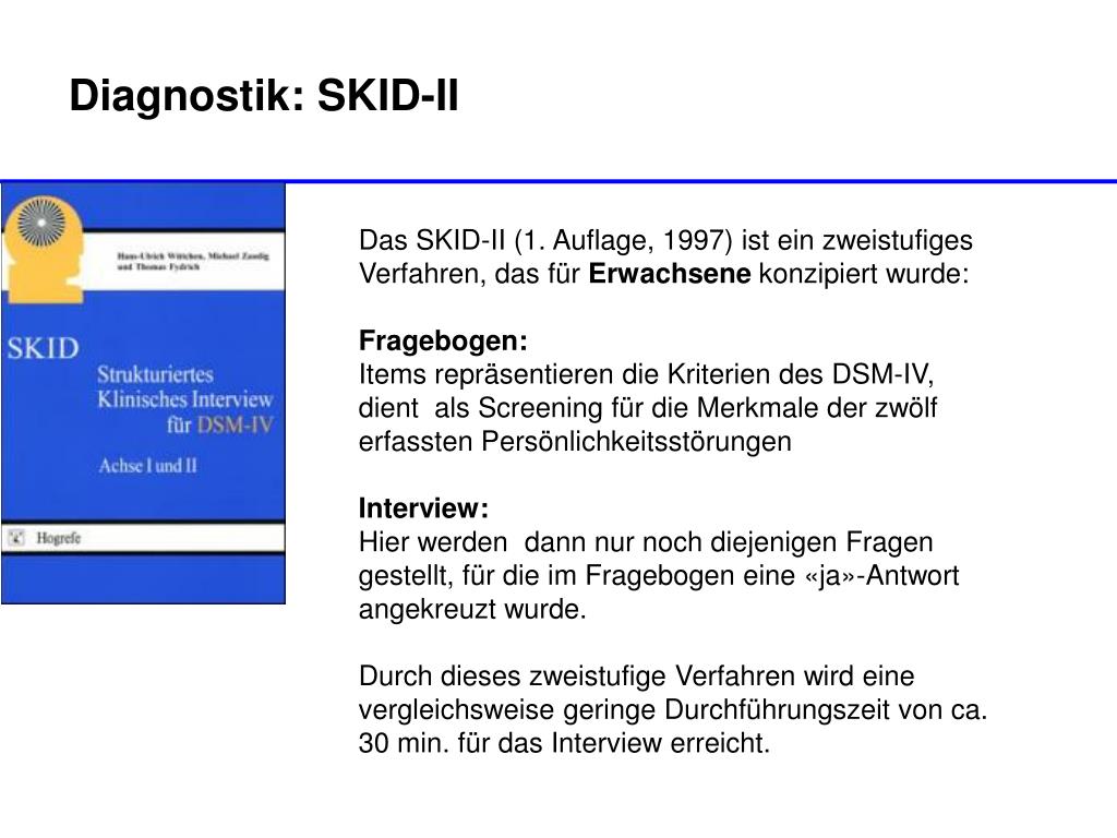 Diagnostik: SKID-II Das SKID-II (1. Auflage, 1997) ist ein zweistufiges Verfahren, das für Erwachsene konzipiert wurde: Fragebogen: Items repräsentieren die Kriterien des DSM-IV, dient als Screening für die Merkmale der zwölf erfassten Persönlichkeitsstörungen Interview: Hier werden dann nur noch diejenigen Fragen gestellt, für die im Fragebogen eine «ja»-Antwort angekreuzt wurde. Durch dieses zweistufige Verfahren wird eine vergleichsweise geringe Durchführungszeit von ca. 30 min. für das Interview erreicht.