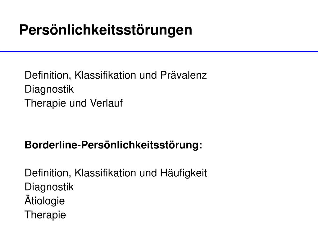 Persönlichkeitsstörungen Definition, Klassifikation und Prävalenz Diagnostik Therapie und Verlauf Borderline-Persönlichkeitsstörung: Definition, Klassifikation und Häufigkeit Diagnostik Ätiologie Therapie