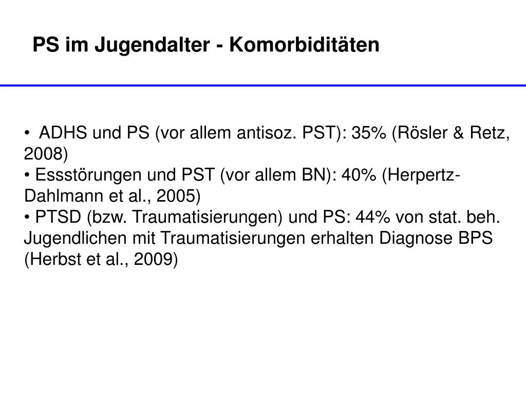 PS im Jugendalter - Komorbiditäten • ADHS und PS (vor allem antisoz. PST): 35% (Rösler & Retz, 2008) • Essstörungen und PST (vor allem BN): 40% (Herpertz-Dahlmann et al., 2005) • PTSD (bzw. Traumatisierungen) und PS: 44% von stat. beh. Jugendlichen mit Traumatisierungen erhalten Diagnose BPS (Herbst et al., 2009)