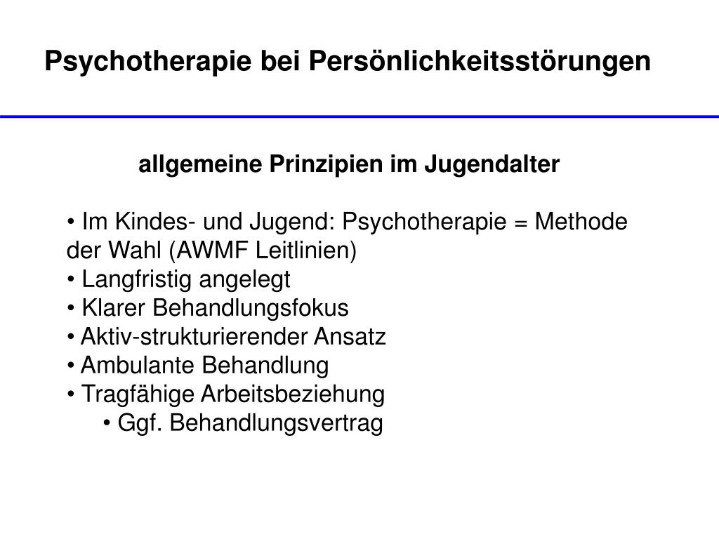 Psychotherapie bei Persönlichkeitsstörungen • allgemeine Prinzipien im Jugendalter • Im Kindes- und Jugend: Psychotherapie = Methode der Wahl (AWMF Leitlinien) • Langfristig angelegt • Klarer Behandlungsfokus • Aktiv-strukturierender Ansatz • Ambulante Behandlung • Tragfähige Arbeitsbeziehung • Ggf. Behandlungsvertrag