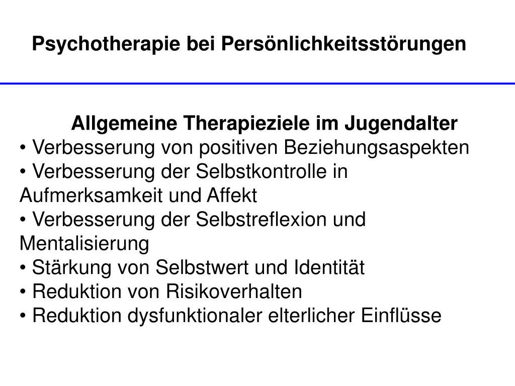 Psychotherapie bei Persönlichkeitsstörungen • Allgemeine Therapieziele im Jugendalter • Verbesserung von positiven Beziehungsaspekten • Verbesserung der Selbstkontrolle in Aufmerksamkeit und Affekt • Verbesserung der Selbstreflexion und Mentalisierung • Stärkung von Selbstwert und Identität • Reduktion von Risikoverhalten • Reduktion dysfunktionaler elterlicher Einflüsse