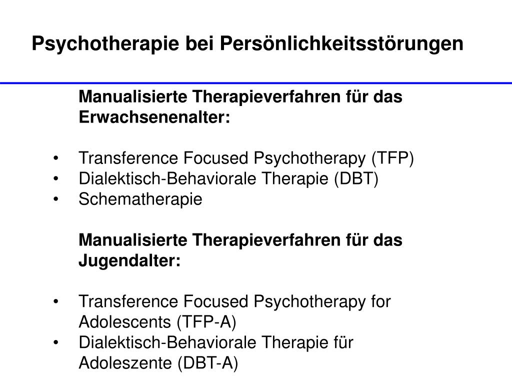 Psychotherapie bei Persönlichkeitsstörungen • Manualisierte Therapieverfahren für das Erwachsenenalter: • Transference Focused Psychotherapy (TFP) • Dialektisch-Behaviorale Therapie (DBT) • Schematherapie • Manualisierte Therapieverfahren für das Jugendalter: • Transference Focused Psychotherapy for Adolescents (TFP-A) • Dialektisch-Behaviorale Therapie für Adoleszente (DBT-A)