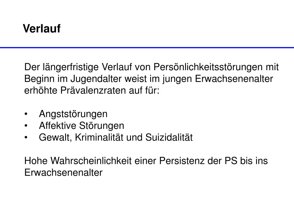 Verlauf • Der längerfristige Verlauf von Persönlichkeitsstörungen mit Beginn im Jugendalter weist im jungen Erwachsenenalter erhöhte Prävalenzraten auf für: • Angststörungen • Affektive Störungen • Gewalt, Kriminalität und Suizidalität • Hohe Wahrscheinlichkeit einer Persistenz der PS bis ins Erwachsenenalter