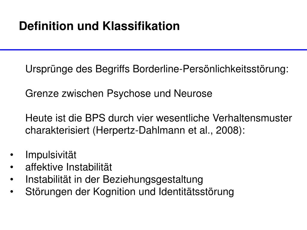 Definition und Klassifikation • Ursprünge des Begriffs Borderline-Persönlichkeitsstörung: • Grenze zwischen Psychose und Neurose • Heute ist die BPS durch vier wesentliche Verhaltensmuster charakterisiert (Herpertz-Dahlmann et al., 2008): • Impulsivität • affektive Instabilität • Instabilität in der Beziehungsgestaltung • Störungen der Kognition und Identitätsstörung