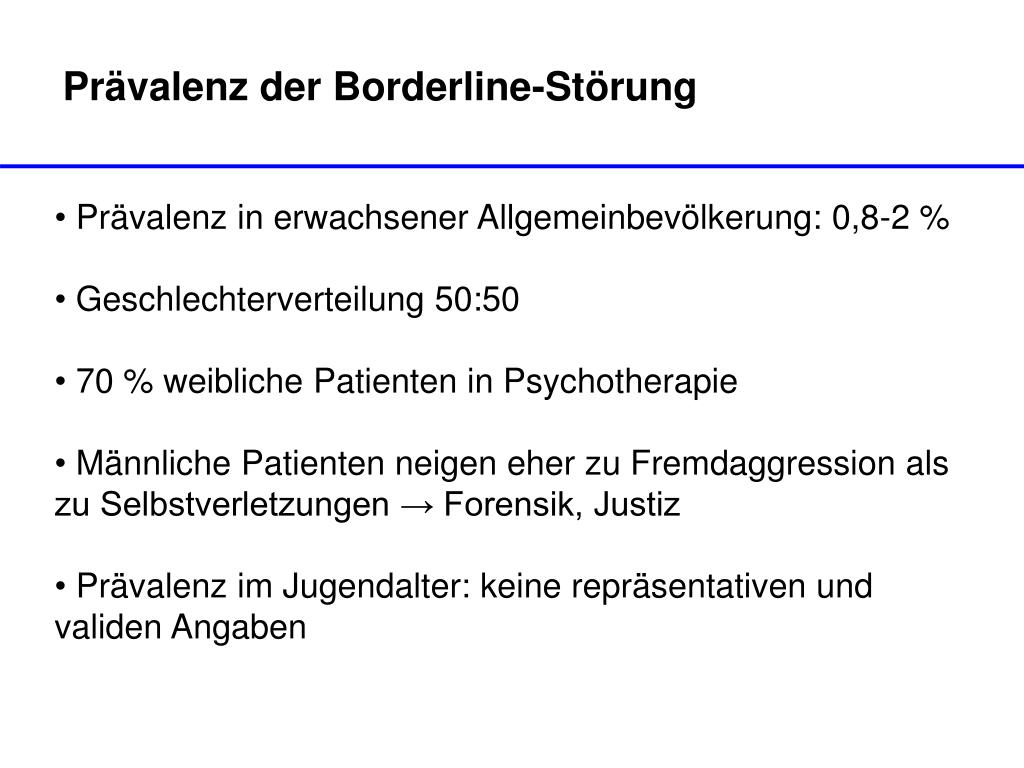 Prävalenz der Borderline-Störung • Prävalenz in erwachsener Allgemeinbevölkerung: 0,8-2 % • Geschlechterverteilung 50:50 • 70 % weibliche Patienten in Psychotherapie • Männliche Patienten neigen eher zu Fremdaggression als zu Selbstverletzungen → Forensik, Justiz • Prävalenz im Jugendalter: keine repräsentativen und validen Angaben