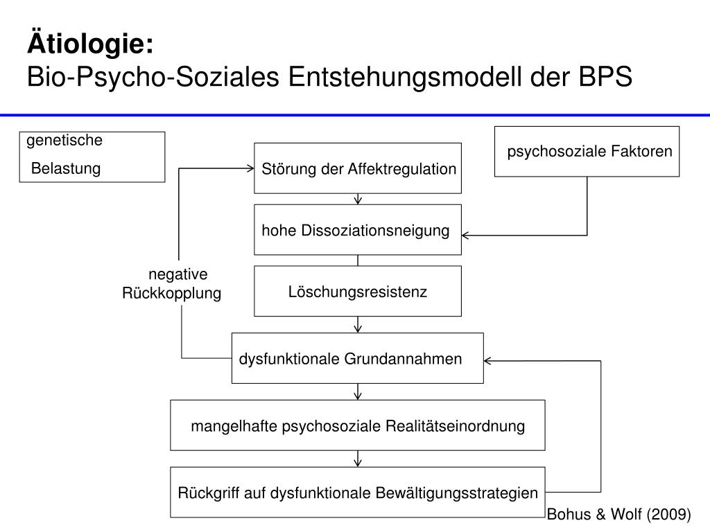 Ätiologie: Bio-Psycho-Soziales Entstehungsmodell der BPS genetische Belastung psychosoziale Faktoren Störung der Affektregulation hohe Dissoziationsneigung negative Rückkopplung Löschungsresistenz dysfunktionale Grundannahmen mangelhafte psychosoziale Realitätseinordnung Rückgriff auf dysfunktionale Bewältigungsstrategien Bohus & Wolf (2009)