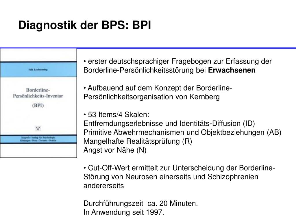 Diagnostik der BPS: BPI • erster deutschsprachiger Fragebogen zur Erfassung der Borderline-Persönlichkeitsstörung bei Erwachsenen • Aufbauend auf dem Konzept der Borderline-Persönlichkeitsorganisation von Kernberg • 53 Items/4 Skalen: • Entfremdungserlebnisse und Identitäts-Diffusion (ID) • Primitive Abwehrmechanismen und Objektbeziehungen (AB) • Mangelhafte Realitätsprüfung (R) • Angst vor Nähe (N) • Cut-Off-Wert ermittelt zur Unterscheidung der Borderline-Störung von Neurosen einerseits und Schizophrenien andererseits • Durchführungszeit ca. 20 Minuten. • In Anwendung seit 1997.