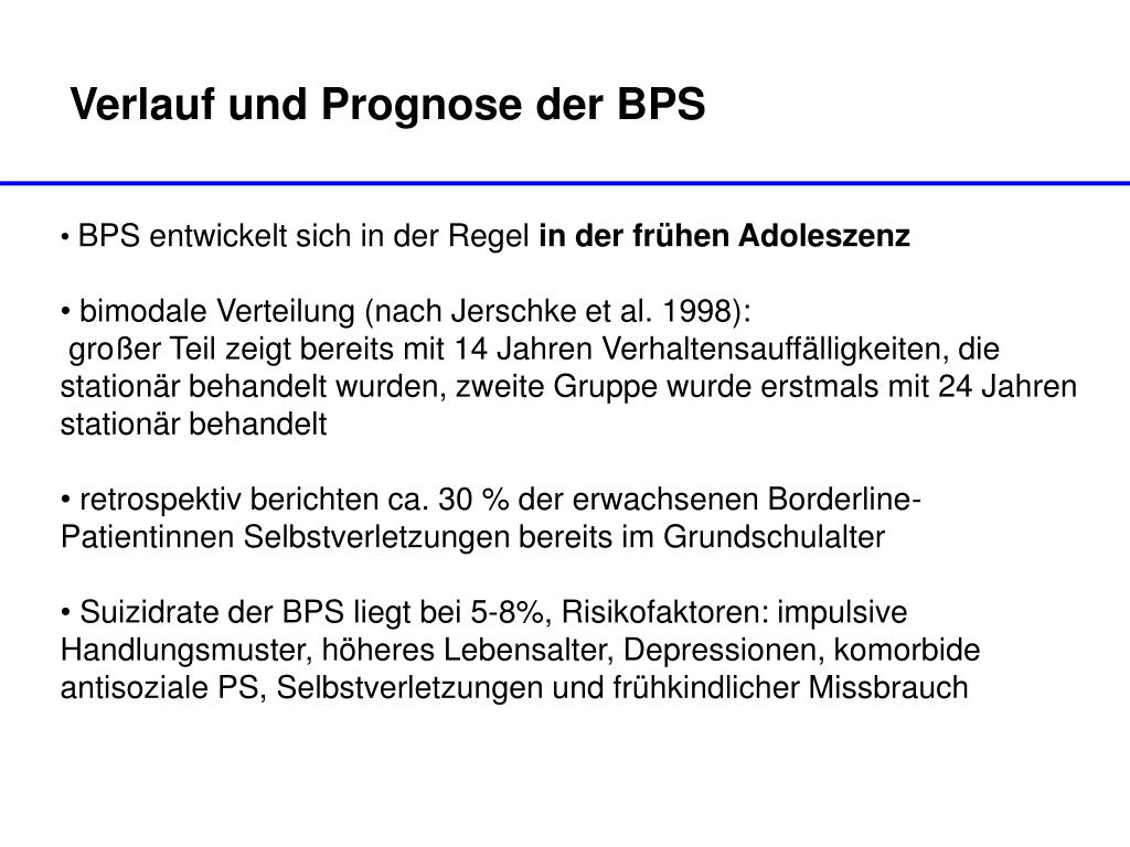 Verlauf und Prognose der BPS • • BPS entwickelt sich in der Regel in der frühen Adoleszenz • bimodale Verteilung (nach Jerschke et al. 1998): • großer Teil zeigt bereits mit 14 Jahren Verhaltensauffälligkeiten, die stationär behandelt wurden, zweite Gruppe wurde erstmals mit 24 Jahren stationär behandelt • retrospektiv berichten ca. 30 % der erwachsenen Borderline-Patientinnen Selbstverletzungen bereits im Grundschulalter • Suizidrate der BPS liegt bei 5-8%, Risikofaktoren: impulsive Handlungsmuster, höheres Lebensalter, Depressionen, komorbide antisoziale PS, Selbstverletzungen und frühkindlicher Missbrauch